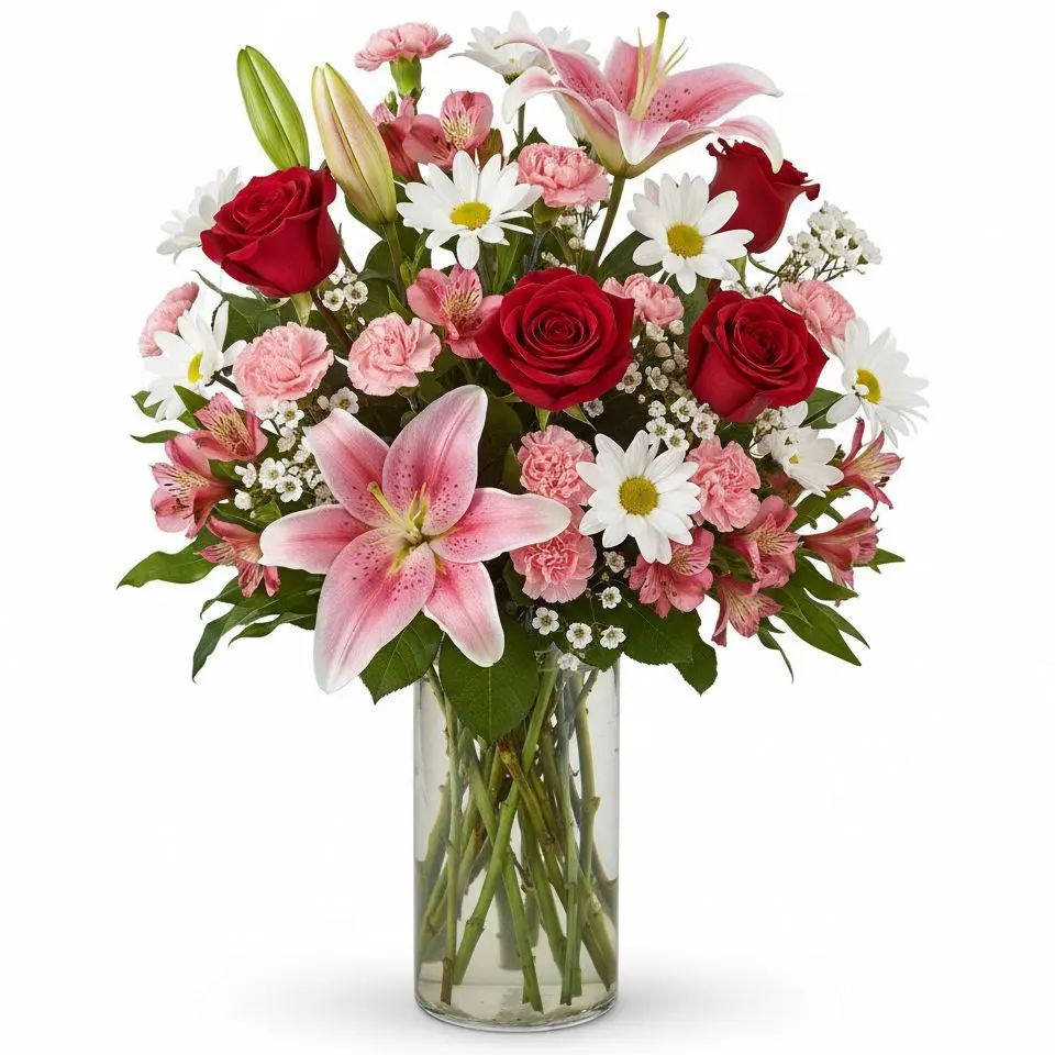 Celebrate love and joy with our exquisite Heartfelt Harmony, a stunning arrangement featuring vibrant red roses, delicate pink lilies, and cheerful daisy poms. This beautiful bouquet, nestled in a clear vase, is perfect for brightening any space and bringing smiles. Send a heartfelt message of happiness and appreciation with this enchanting floral creation.